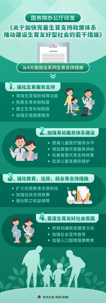 国务院办公厅印发的《关于加快完善生育支持政策体系推动建设生育友好型社会的若干措施》10月28日对外发布,从4个方面提出13条具体举措,降低生育、养育、教育成本,营造全社会尊重生育、支持生育的良好氛围。