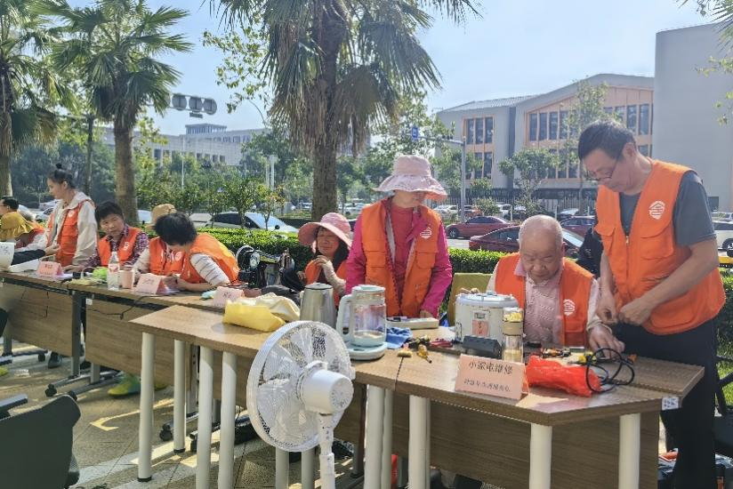 在平湖市当湖街道友邻中心门口,采访报道组成员们被热闹温馨的场景所吸引。洗眼镜、量血压、磨菜刀、小家电修理等服务项目,吸引了众多居民参与。重阳节当天,“叶跃平志愿服务队”为社区居民送上特别的节日礼物。“今天一早我们就来啦,这已经是我修的第3个锅了。”志愿者叶跃平身穿橙色马甲,正在修理居民送来的锅碗瓢盆。20多年志愿服务的坚持和热爱,使他成为社区居民心中的“明星”。