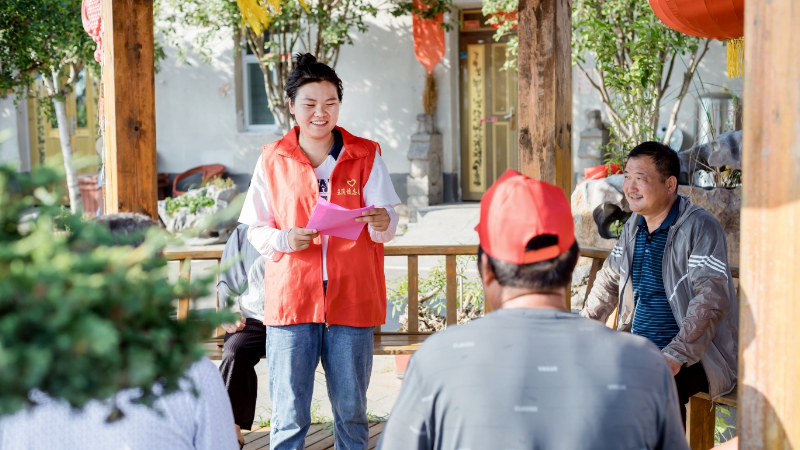 淮罗村志愿者向群众宣传人居环境卫生整治。阜阳市文明办供图