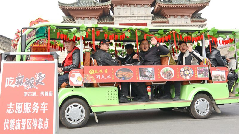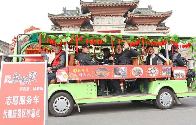 “天水麻辣烫”火爆以来,天水市奋力开展了一场“麻辣烫”长红与城市文明相互成就的“双向奔赴”,实现了流量经济、城市文明程度双提升。图为天水市组织的志愿服务车在伏羲庙接送外地游客。(天水市文明办供图)pagebreak