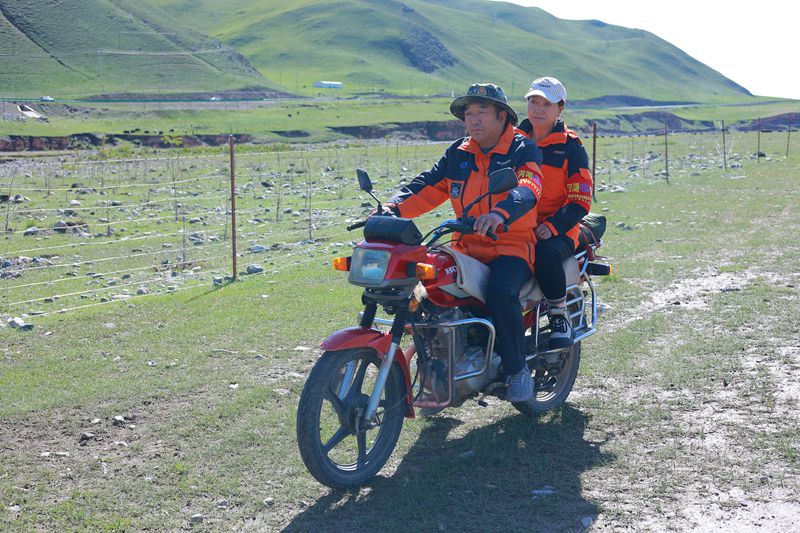资料图:青海省海北藏族自治州祁连县黑河源头生态管护员、“中国好人”叶金俄日(前)与东木措(后)正骑摩托车前往巡查点。新华网发(祁连县文明办供图)