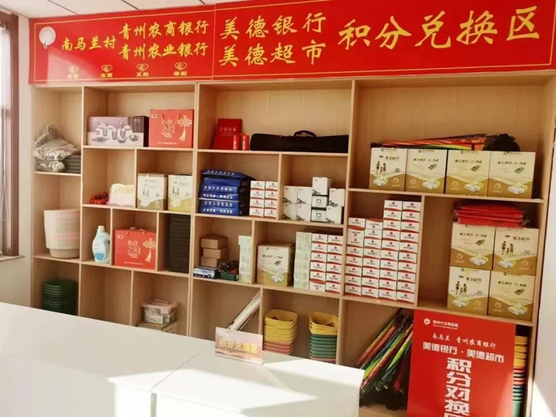 潍坊青州市南马兰村的“美德超市”积分兑换区。新华网发(潍坊青州市文明办供图)
