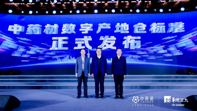 图为李金祥(中)、邓彬(右)、魏建和上台,代表中国乡村发展协会对外发布《中药材产地仓建设通用要求》。