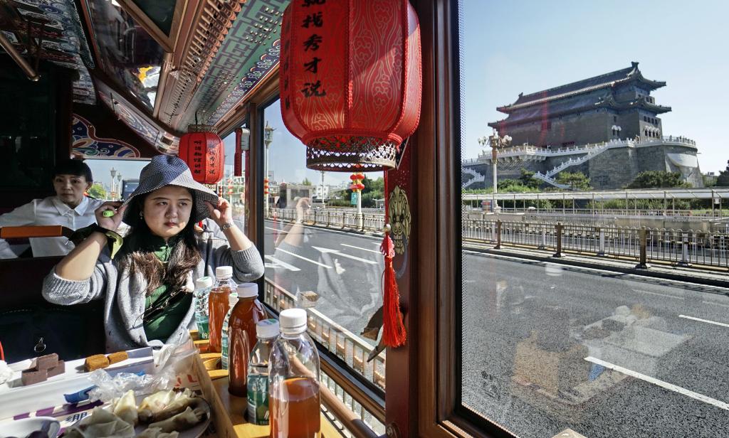 中轴线上的“铛铛车”途经前门城楼。新华社记者 李欣 摄