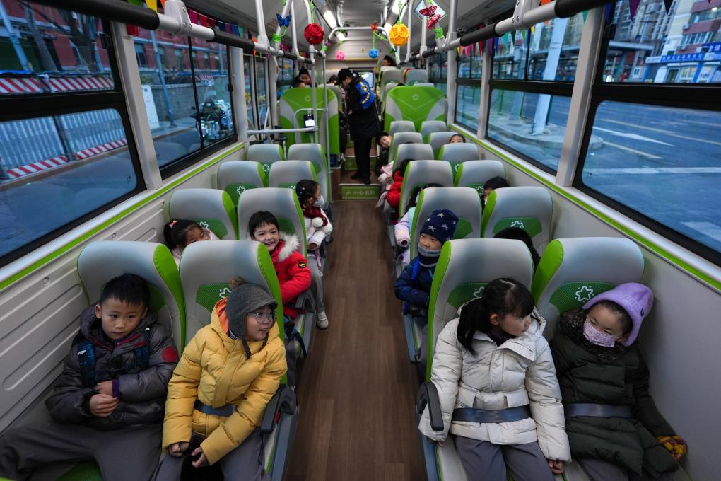 12月16日,学生们乘坐通学车前往呼家楼中心小学。新华社记者 鞠焕宗 摄