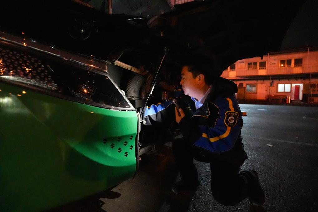 12月16日,北京市朝阳区东大桥公交场站,果长义在检查车况。新华社记者 鞠焕宗 摄