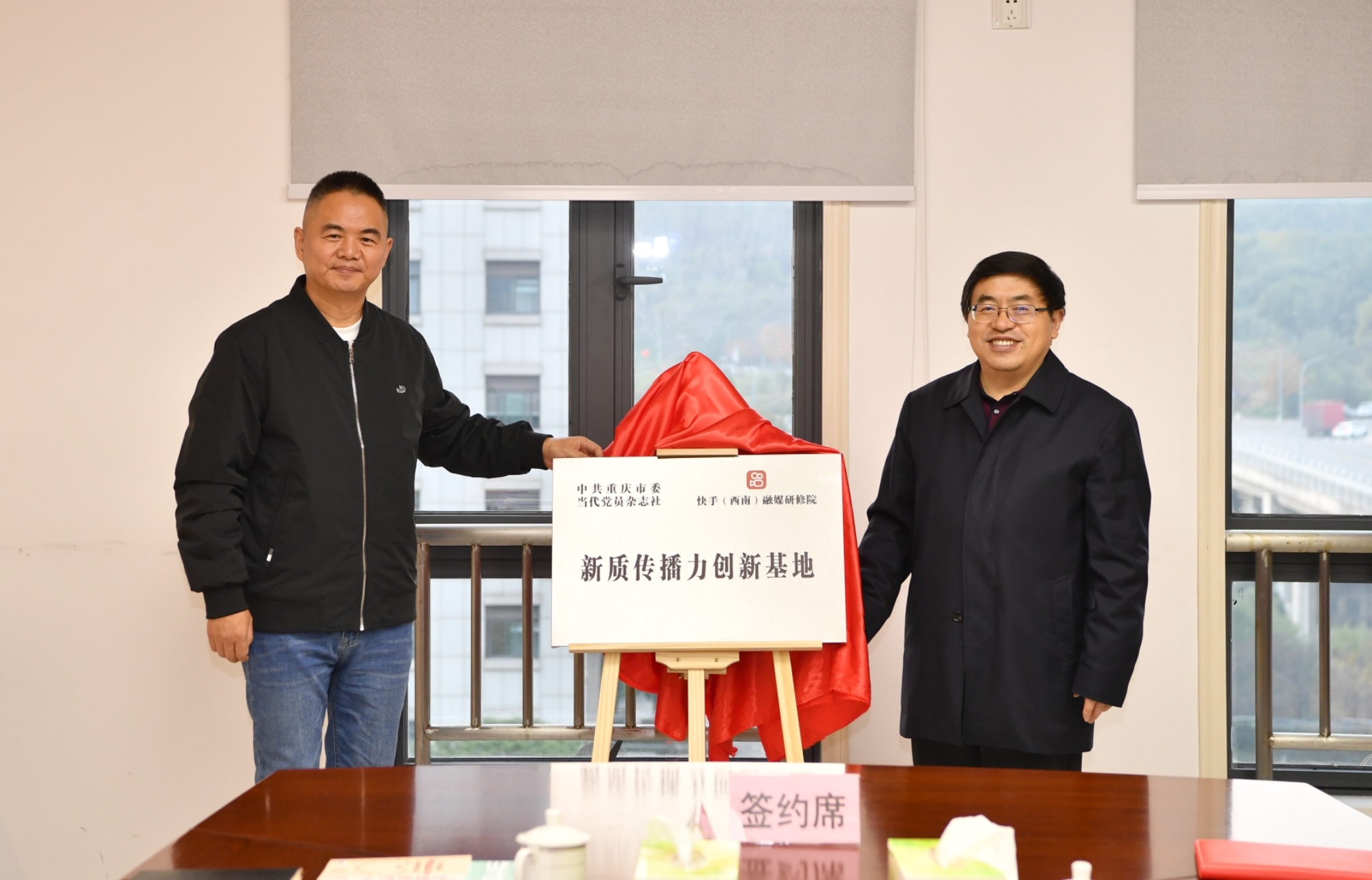 12月19日下午,中共重庆市委当代党员杂志社、快手(西南)融媒研修院战略合作协议签约暨“新质传播力创新基地”揭牌仪式在当代党员杂志社举行。当代党员杂志社总编辑张倵瑃、副总编辑杨安军,快手(西南)融媒研修院院长张子贤、副院长潘浩、副院长兼课程总监何小谷出席签约和揭牌仪式。