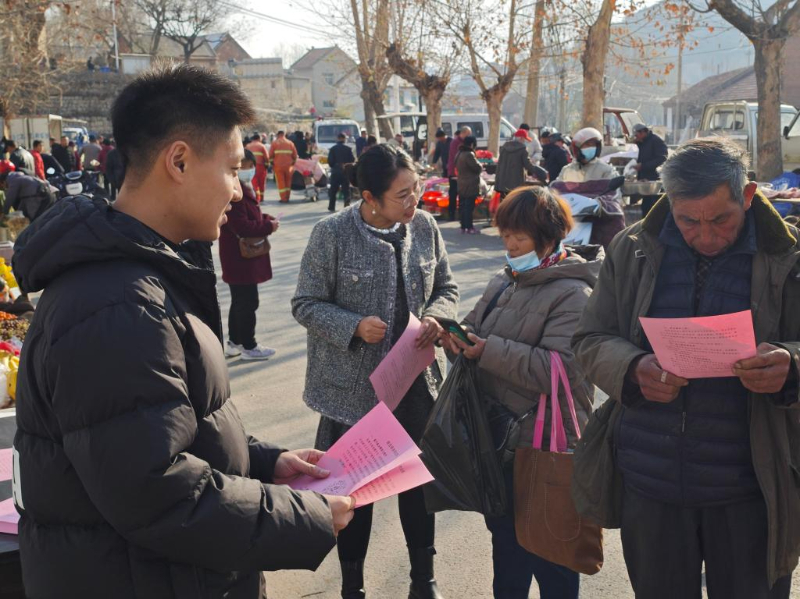 在山东省淄博市淄川区西河镇张庄大集,人社部门工作人员正在进行就业政策宣传。(淄川区人社局供图)