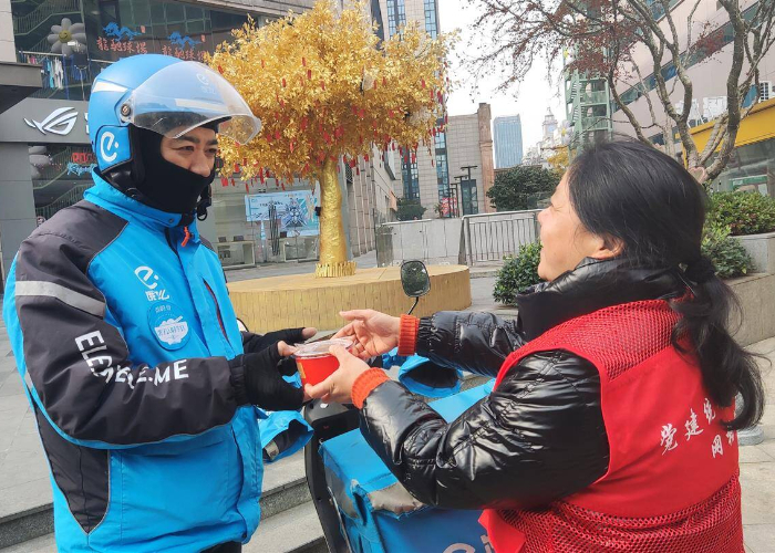 “来来来,喝一碗粥暖暖身子……”1月7日是腊八节,正在世贸城市广场兰溪街门口等候单子的外卖骑手胡峰怎么也想不到,会有社区网格员送来热气腾腾的腊八粥。