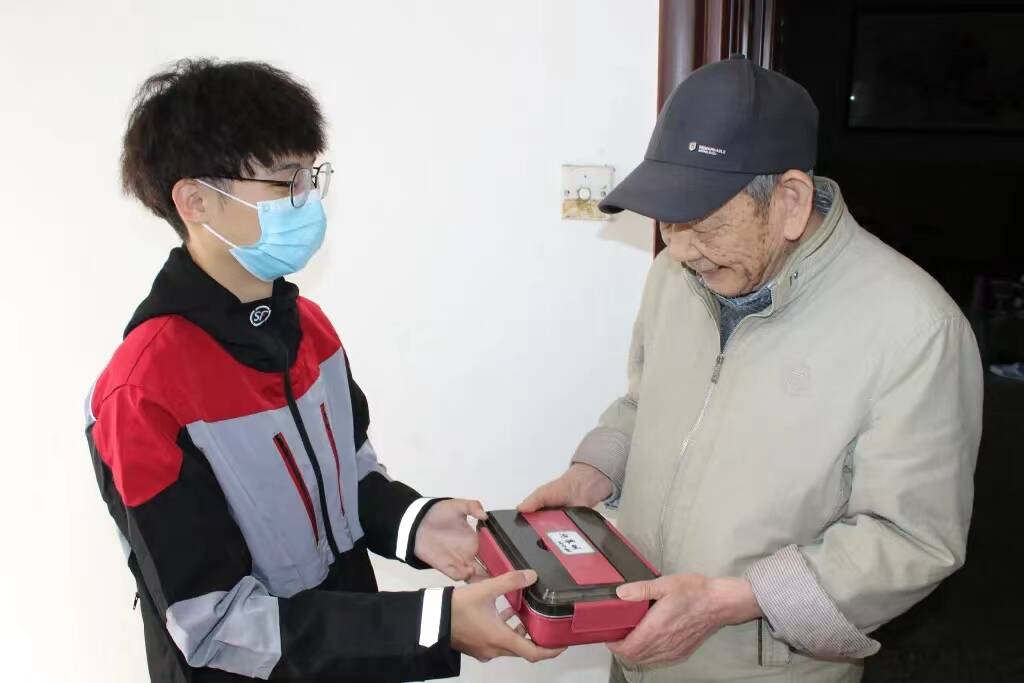在江滨社区,有一支由快递小哥组成的送餐队伍。“阿姨,这是今天的盒饭,您趁热吃……”顺丰小哥龚毅在完成上午的快递投送工作后,从社区居家养老服务中心取过餐盒,开始为2名老人提供上门送餐的志愿服务。
