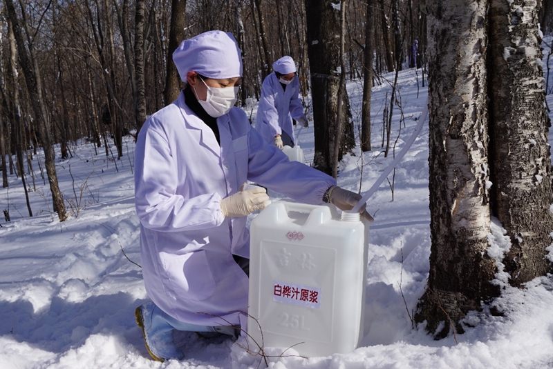 据了解,白桦汁,学名桦树液,是从白桦树干中引流出的无色透明或略带微黄的新鲜汁液,散发有淡淡的桦树清香。每年冬末初春、冰雪消融之时,桦树的根系利用根压作用从土壤里吸收大量水分和矿物质,水分携带丰富的矿物质向上运输,桦树汁便在这种集聚溶解的情况下形成,有10至15天出汁期,每棵树每天平均产汁1千克至1.5千克。目前,桦甸市现有白桦树337.7万株,其中128万株达到树汁采集标准。超百万株的白桦树,为白桦汁的供给提供了最原生的“原料库”,也为该产业的发展奠定坚实的产业基础。