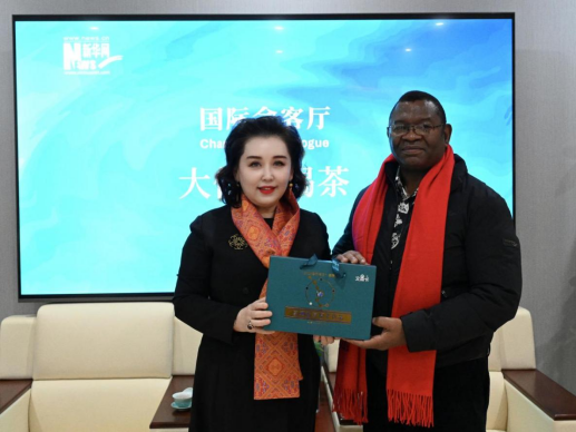 中华茶文化大使、中国茶美学与茶科技发展中心主任董晓欣向赞比亚驻华大使伊文·齐乌卢赠送“文森卡”富硒产品。