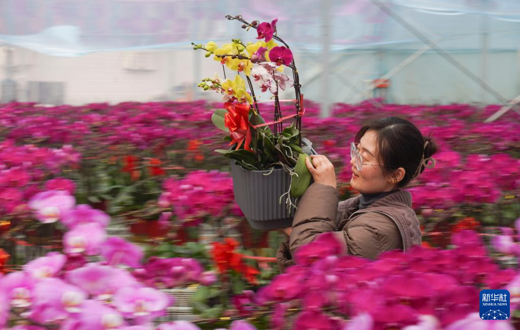 1月24日,花农在山东省邹平市好生街道花卉市场为消费者搬运蝴蝶兰。