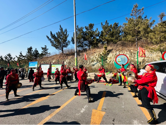 除了高铁站的“非遗集市”,莱州的大基山庙会同样热闹,吸引了大量市民和游客前来参与。一场来自西北黄土高原的国家级非物质文化遗产代表性项目——晋南威风锣鼓表演,为这场庙会增添了别样的文化魅力。