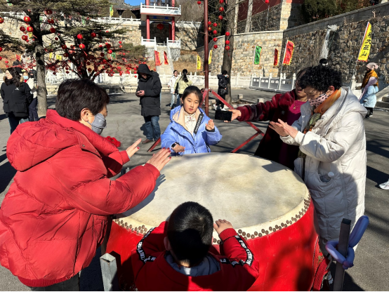 大年初一,莱州市民在大基山庙会上击鼓祈福。新华网 刘娜摄