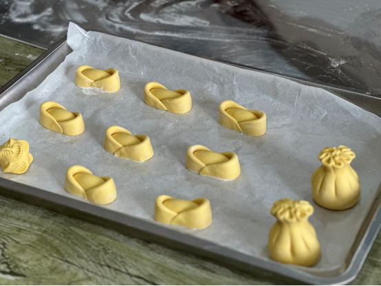 图为捏好的“元宝”和“福袋”面塑。新华网 刘娜摄