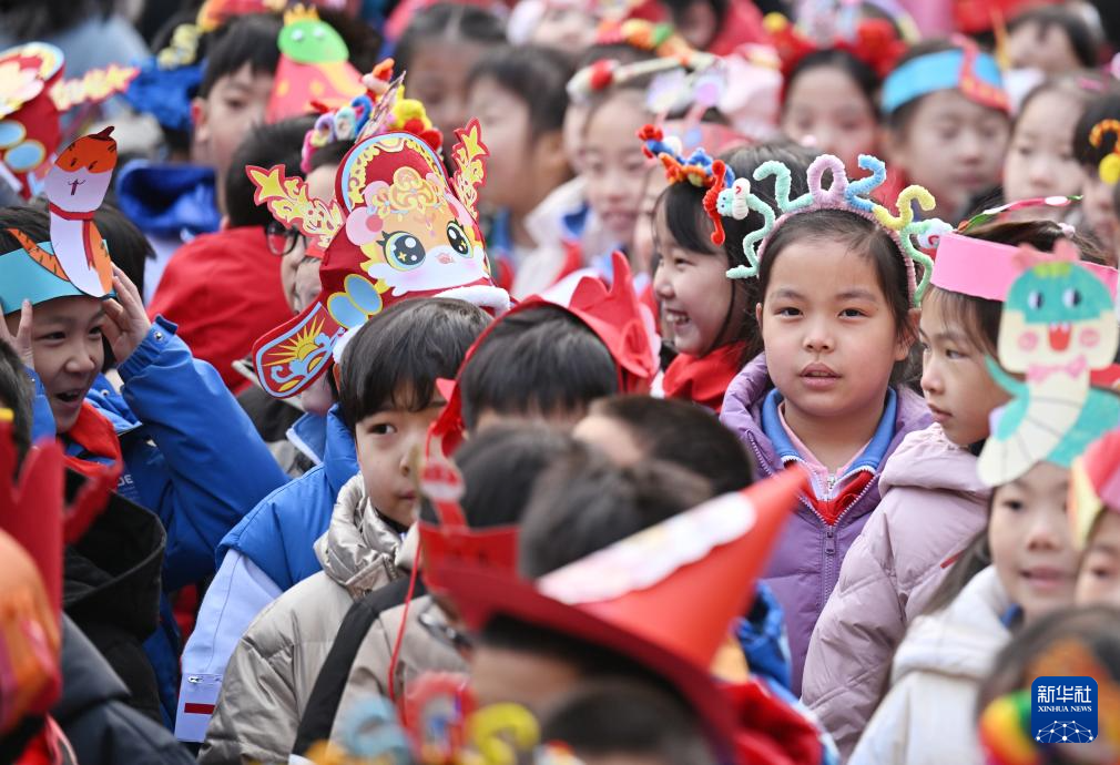 2月17日,在天津市和平区新星小学,学生们头戴蛇年装饰参加开学典礼。