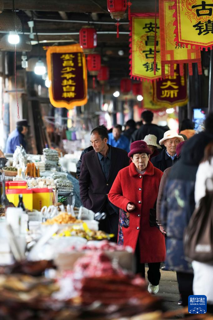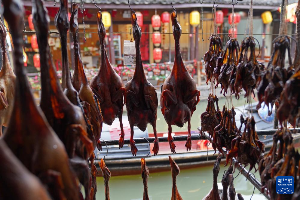 3月29日,游客在安昌古镇的街市上购买腊味食品。