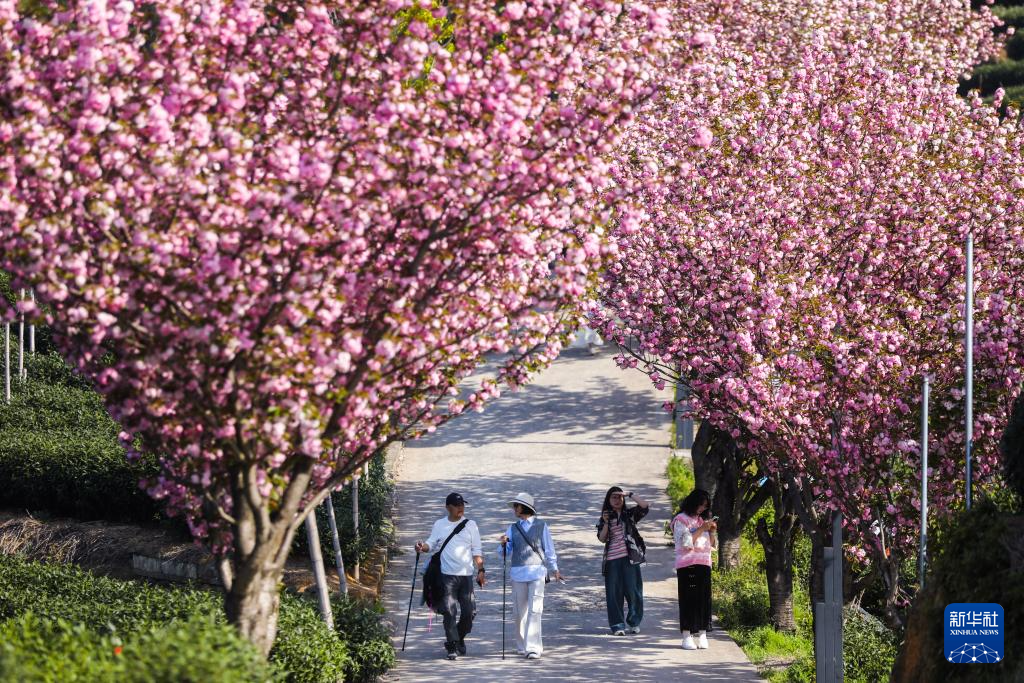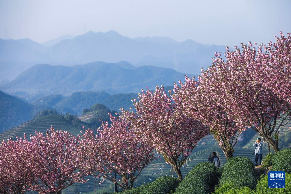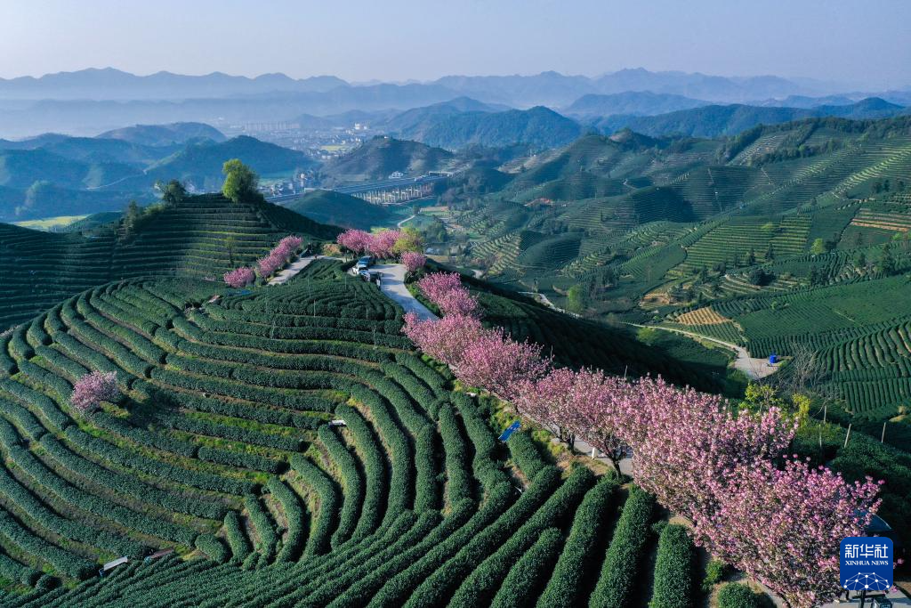 近期,浙江省杭州市富阳区富春街道拔山村万亩茶山上的樱花树进入盛花期,沿着蜿蜒的茶园登山道,千株晚樱错落分布在茶园各处,“间株樱花间株茶”的美景徐徐展开。