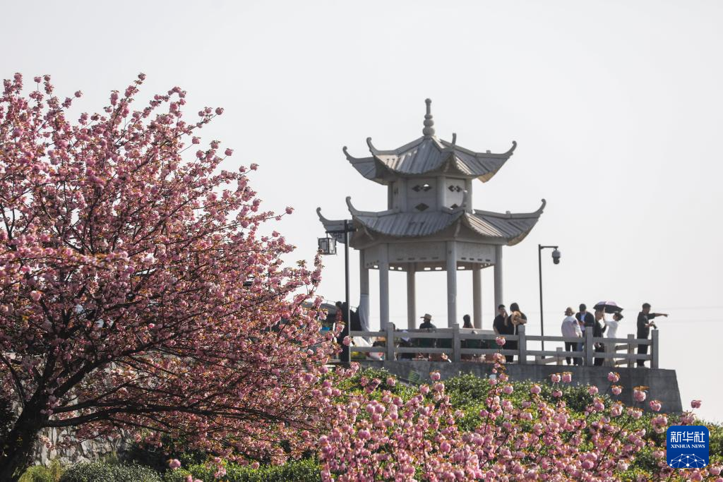 4月6日,游客在拔山村万亩茶园观赏樱花。新华社记者 徐昱 摄