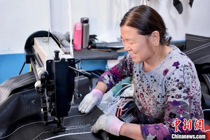 山西省大同市云冈区鸦儿崖乡高屯社区的帮扶车间内,女工操作机器缝制。宋佳烨 摄