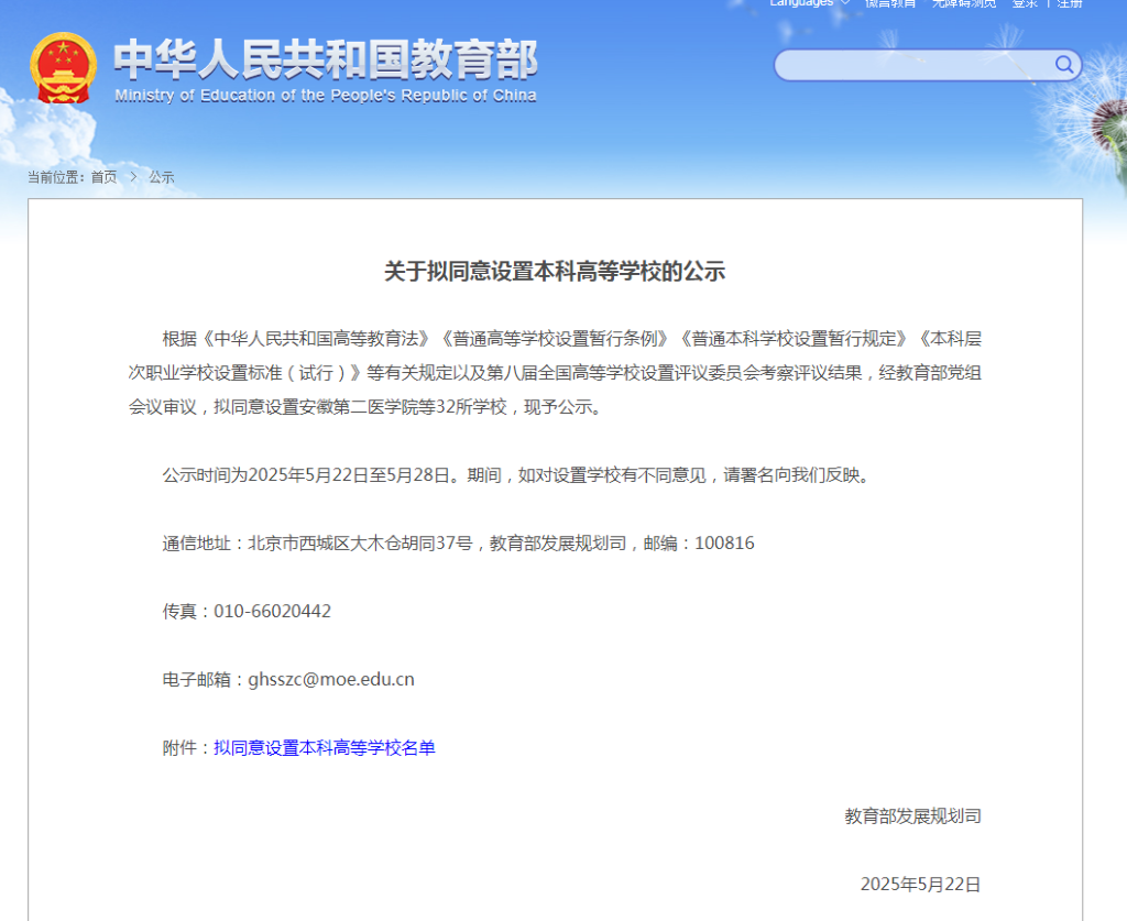 记者5月22日从教育部获悉,根据有关规定以及第八届全国高等学校设置评议委员会考察评议结果,经教育部党组会议审议,拟同意设置安徽第二医学院等32所学校。教育部自2025年5月22日至5月28日对名单进行公示。(记者施雨岑)