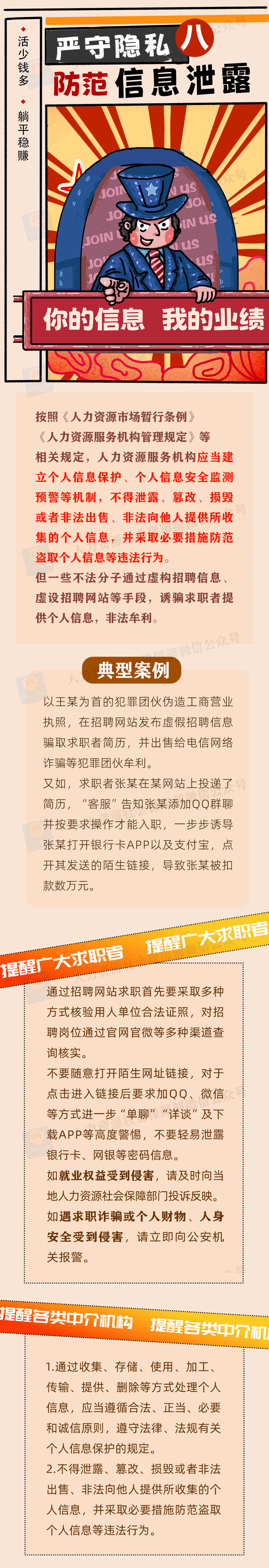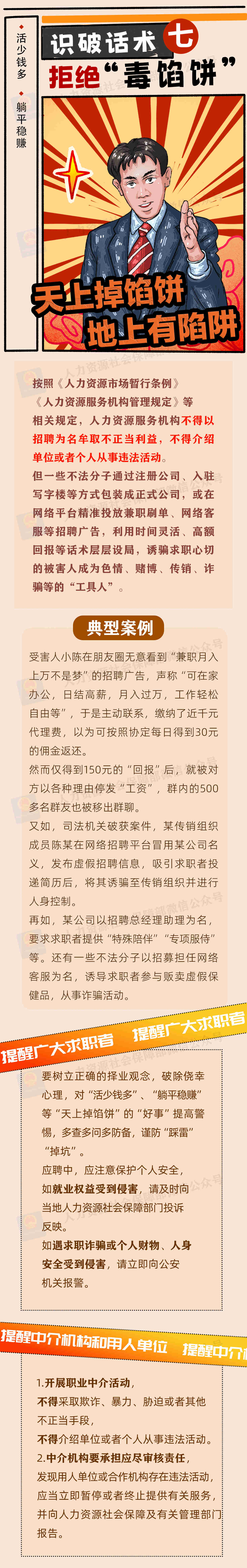 为加强风险防范,人力资源社会保障部、中央网信办、教育部联合发布招聘欺诈典型案例,揭示不法分子的惯用手法和话术套路,帮助高校毕业生等广大求职者提高风险识别意识,增强自我保护能力。