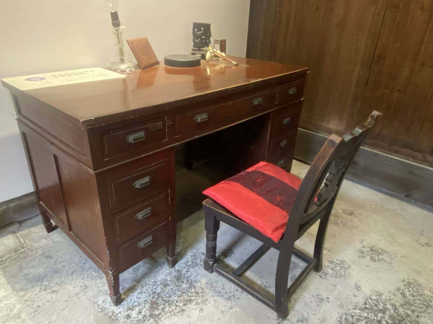 有心的孩子,会发现书桌前的椅子看起来很普通,但又有点奇怪。是的,椅子矮了一截——椅子的脚被锯掉了。这是因为鲁兵高度近视,晚年左眼视力只有0.05,右眼几乎失明,他要趴在桌子上,才能看清稿纸上的字。为了看稿写字更省力,鲁兵动手把椅子的脚锯掉了。
