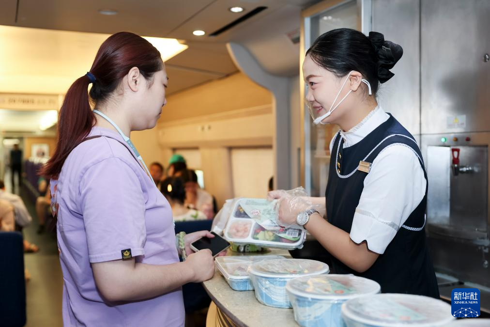 7月1日,长三角铁路上的餐饮服务员为旅客介绍新品餐食。