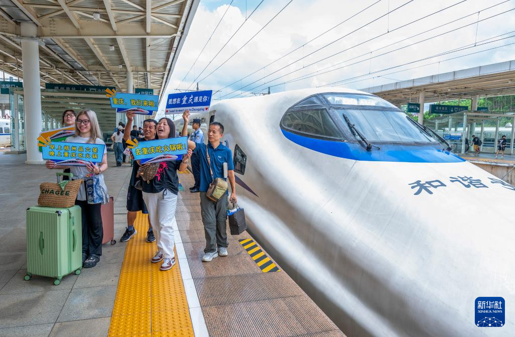 7月1日,梧州南至重庆西开行直达列车,旅客在梧州南站站台上与即将发往重庆的列车合影留念。