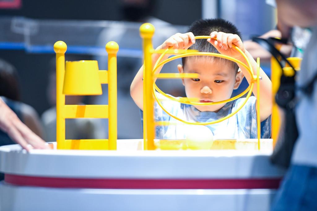 7月8日,小朋友在河北省科学技术馆体验科普设备。