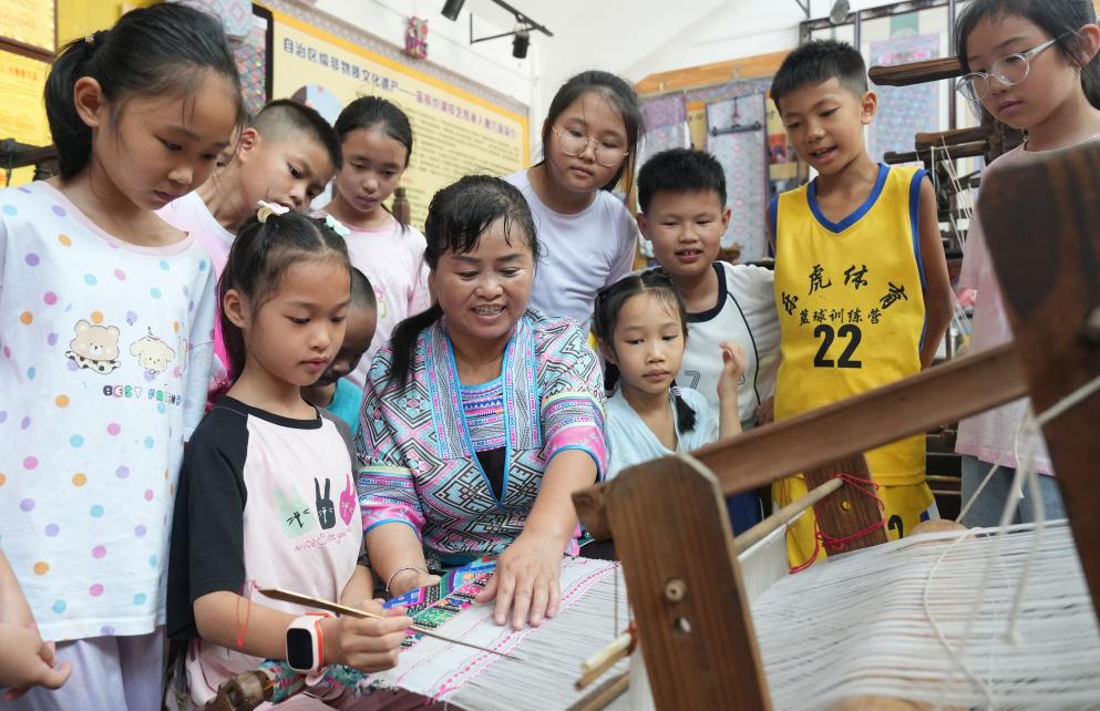 7月7日,在广西柳州市融水苗族自治县苗族织锦传习体验馆,手工艺人唐巧英指导学生学习苗族织锦。