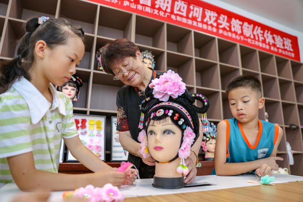 7月8日,小学生在江西省庐山文化馆暑期西河戏头饰制作体验班上学习传统手工技艺。