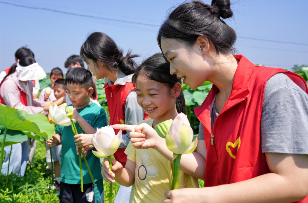 7月7日,在江苏省海安市墩头镇千步村,南京工业大学建筑学院大学生志愿者在浅水藕田边教小学生认识荷花和莲蓬。