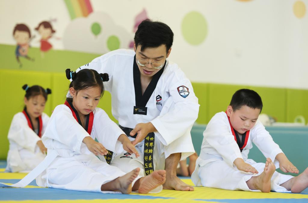 7月7日,在浙江省湖州市德清县乾元镇直街社区青少年宫,孩子在老师指导下学习跆拳道。