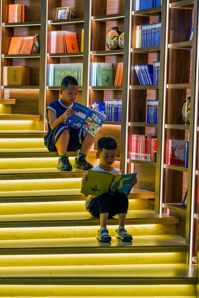 7月8日,小朋友在河北省遵化市新华书店阅读。
