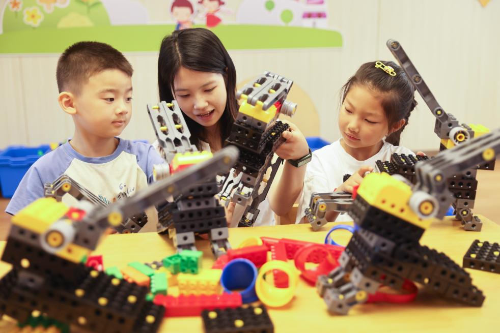 7月7日,在浙江省湖州市德清县乾元镇直街社区青少年宫,孩子在老师指导下组装积木。