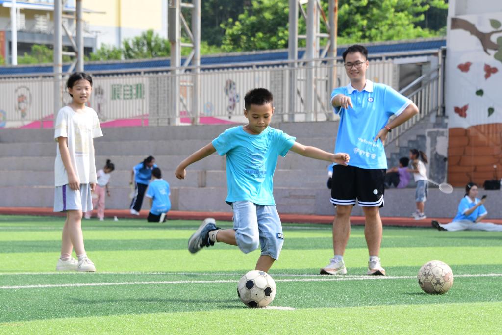 7月7日,在广西河池市罗城仫佬族自治县深圳实验小学,广西民族大学青年志愿者教小朋友踢足球。