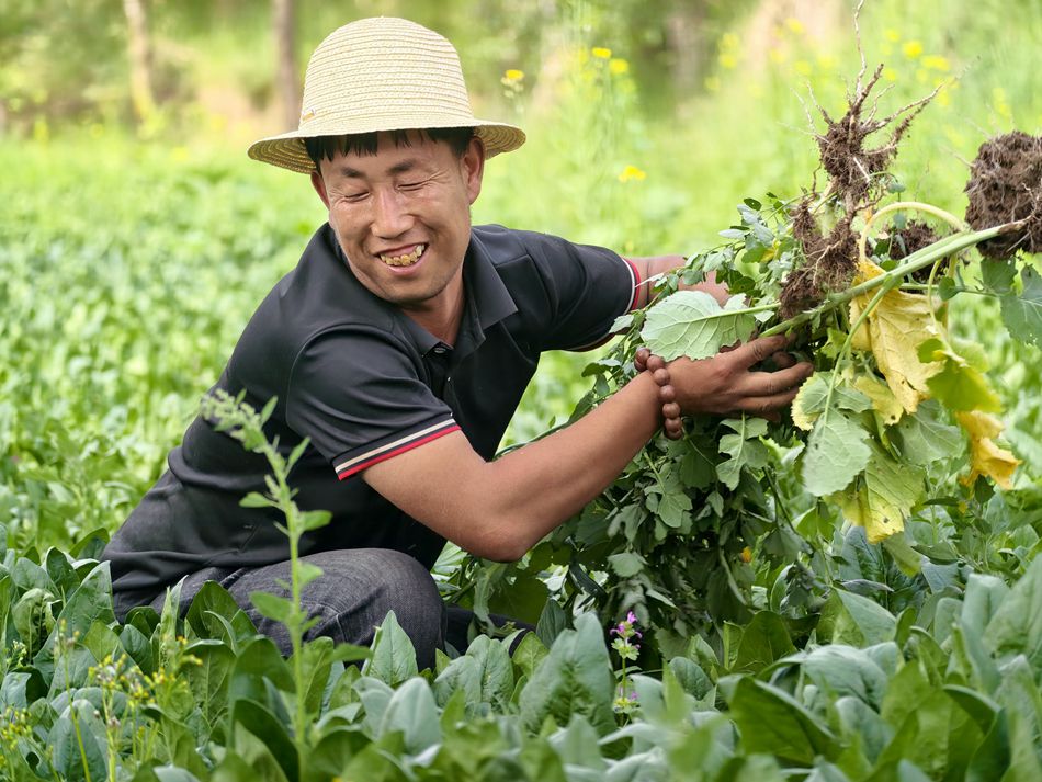 7月11日,青海省西宁市湟中区共和镇苏尔吉村,村民正在给无公害菠菜除草。新华网记者 钟奕 摄