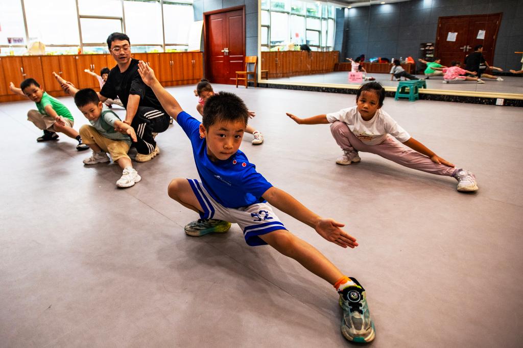 8月11日,在广西南宁市兴宁区文化馆,体育老师指导小学生进行武术基本功练习。