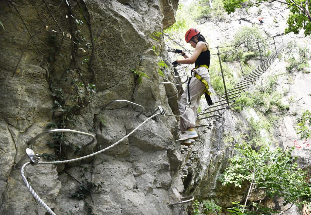 8月12日,在山东省枣庄市山亭区抱犊崮景区,一名小游客体验“飞拉达”攀岩项目。