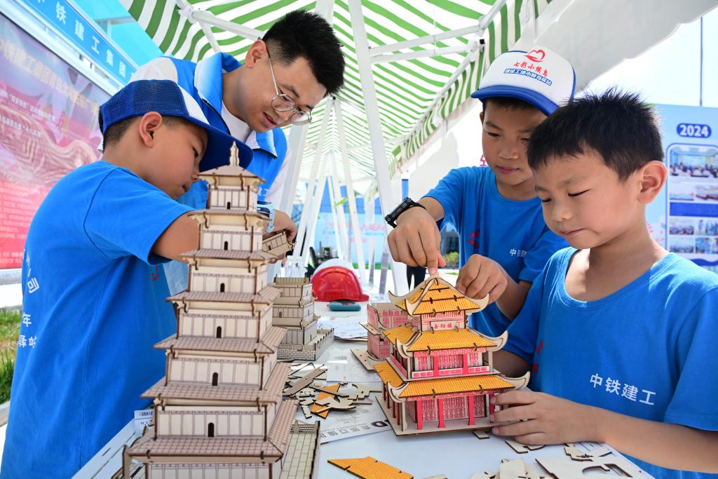 8月12日,在山东青岛,2025年建设工地“小候鸟”驿站暑托班的孩子们在拼装建筑模型。