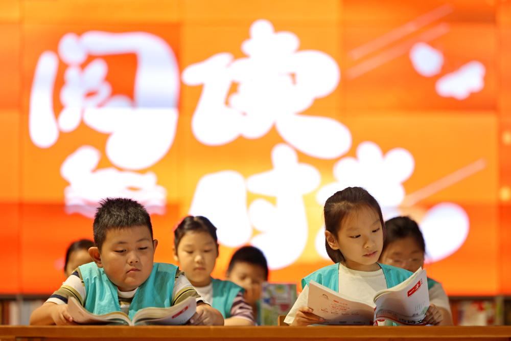 8月11日,在山东省枣庄市鲁南书城举办的阅读夏令营活动中,小朋友在阅读图书。