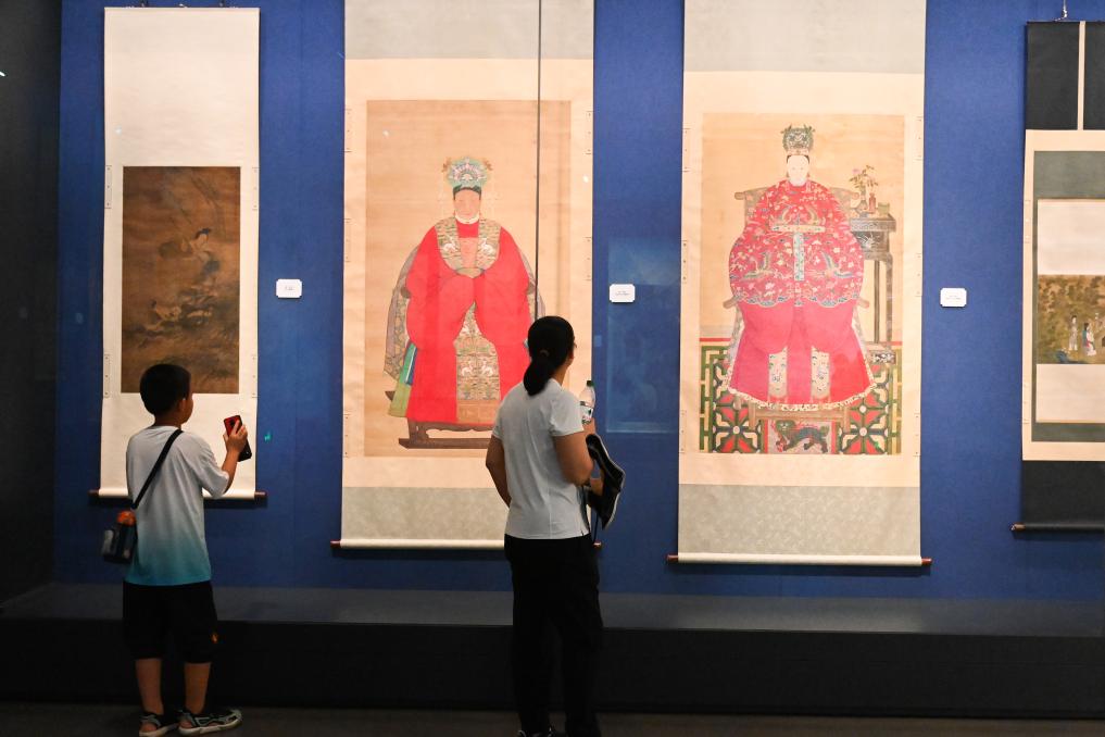 8月10日,家长带领小朋友在山东省青州博物馆观看古代绘画展。
