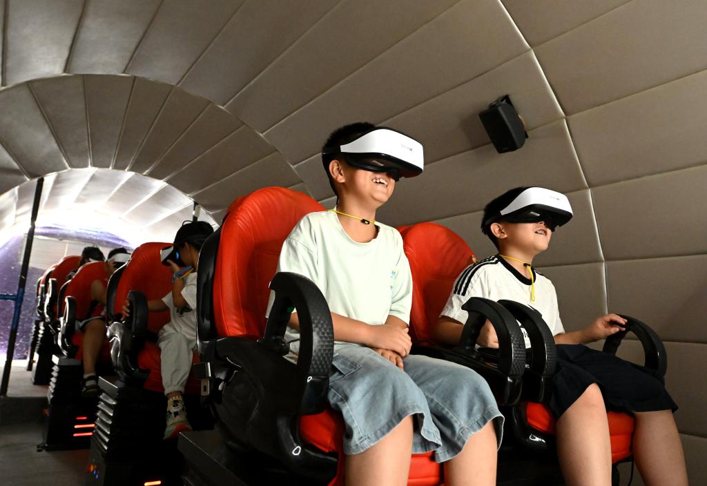 8月12日,在河北省石家庄市一家航天科技体验馆,小朋友在模拟太空舱内体验。