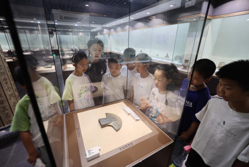 8月12日,在山东省临沂市沂南县博物馆,小朋友们参观馆藏文物。