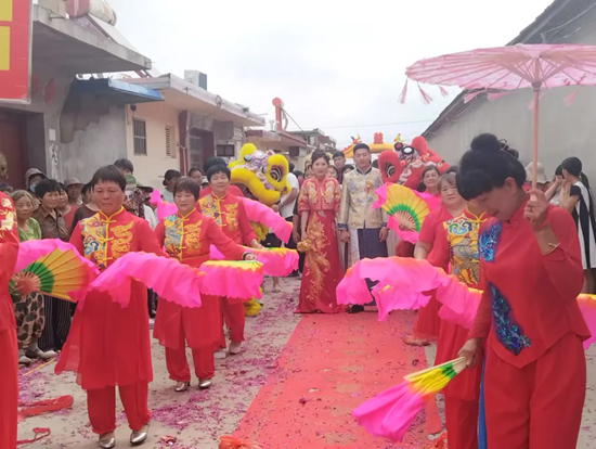 在碑廓镇田家寨二村的一场婚礼中,村文艺队与文明迎亲队携手合作。文艺队带来了精彩的特色文艺表演,如欢快的舞蹈、动听的歌曲,志愿者们则在一旁维持秩序、引导宾客,确保婚礼顺利进行。这场婚礼不仅是新人的幸福时刻,更是一场移风易俗的宣传活动,让村民们在欢乐中接受了文明新风的洗礼。