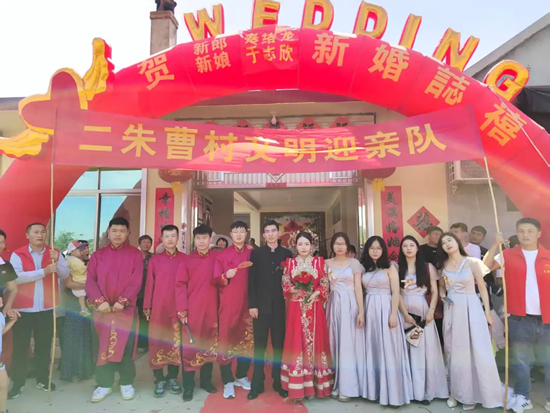 在碑廓镇二朱曹村、郁家村等新人婚礼现场,文明迎亲同样开展得如火如荼。他们统一配备了彩旗、锣鼓等设备,整齐的着装和饱满的热情为婚礼增添了不少仪式感。“真是很感谢文明迎亲队的志愿者,孩子的婚礼既热闹又不失体面,没有那些乱七八糟的闹婚环节,我们全家都舒心!”二朱曹村的新郎父亲秦先生脸上满是笑容。
