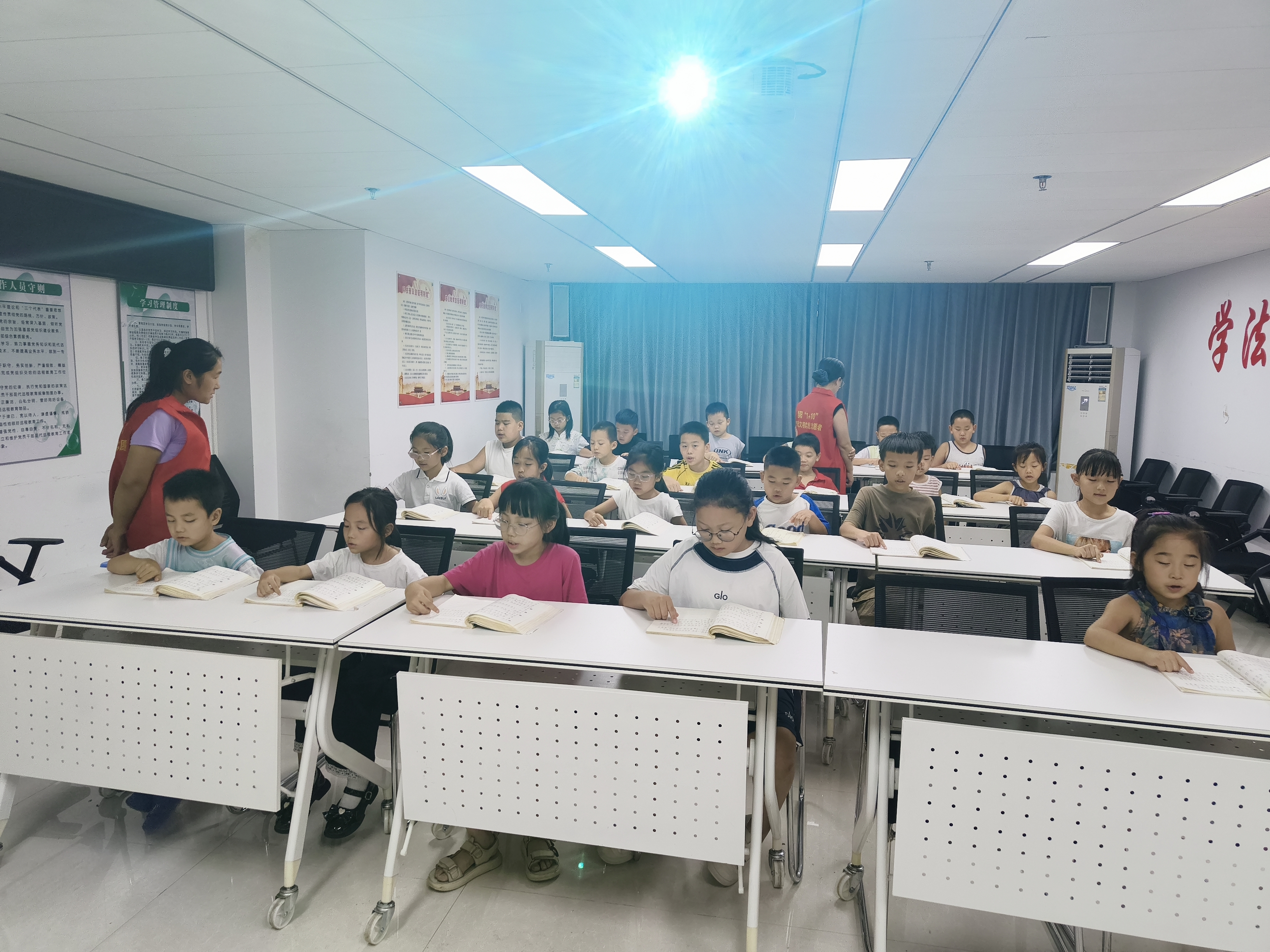 2025年7月,在饶阳县桥西社区新时代文明实践站,“国学课堂”开课。图为小朋友们正在诵读《弟子规》。衡水市饶阳县委宣传部供图