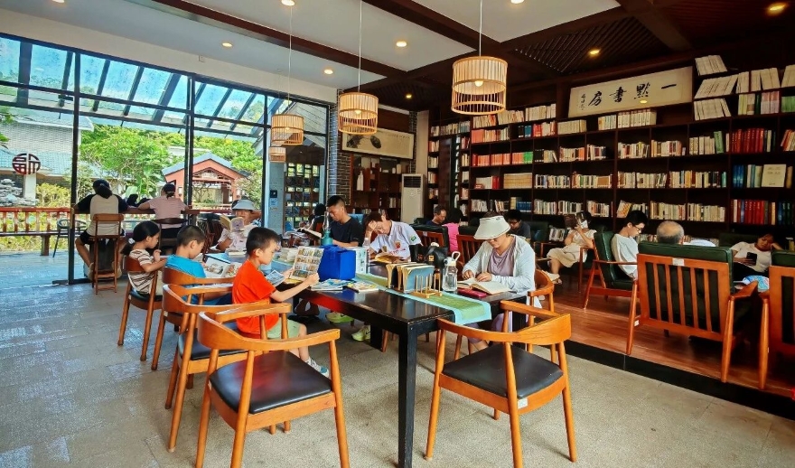 夏日的岭南书院(江心岛书院)里,阳光透过翠绿的树叶洒下斑驳光影。宽敞明亮的公共书房内,微风轻拂,书香弥漫。人们或坐或倚,沉浸在书海之中。